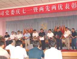 大會在雄壯的國歌聲中開始。公司黨委委員、總經(jīng)理姬洪利同志宣讀了公司黨委《關(guān)于表彰2007年度暨2008年“爭先創(chuàng)優(yōu)”活動先進集體和優(yōu)秀個人的決定》。在工作人員宣讀完受表彰的先進集體和優(yōu)秀個人名單后,大會對在2007年度為企業(yè)發(fā)展和進步做出突出貢獻的7個先進基層黨組織和2個黨風(fēng)廉政建設(shè)先進黨總支、支部及2008年“爭先創(chuàng)優(yōu)”競賽活動涌現(xiàn)出的5個優(yōu)勝黨總支、支部和10名模范黨員頒發(fā)了獎牌和獎杯。王德華、文興峰、姚金崗三名同志分別代表先進基層黨組織、優(yōu)秀共產(chǎn)黨員、和“爭先創(chuàng)優(yōu)”模范黨員做了表態(tài)發(fā)言。