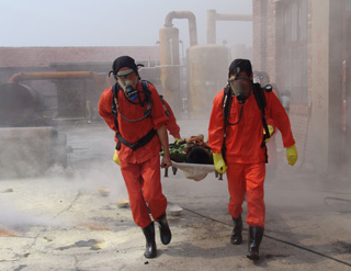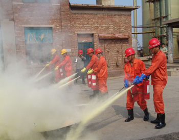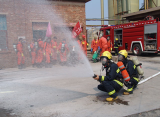 在模擬火災(zāi)現(xiàn)場(chǎng),救援車輛滿載救援隊(duì)員及搶救器材、物資在第一時(shí)間進(jìn)入現(xiàn)場(chǎng),救援人員使用干粉滅火器,對(duì)準(zhǔn)火源,迅速將火撲滅。與此同時(shí),在模擬液氯鋼瓶泄漏救援演練現(xiàn)場(chǎng),液氯鋼瓶發(fā)生泄漏,救援人員一面組織現(xiàn)場(chǎng)人員用濕毛巾捂住口,向上風(fēng)口方向緊急疏散;一面佩戴專業(yè)空氣呼吸器,身著防化服,用液氯捕消器對(duì)泄漏源實(shí)施氯氣捕消和封堵,并將封堵后的鋼瓶由叉車送到液堿池進(jìn)行中和處理。在救援過(guò)程中,現(xiàn)場(chǎng)有一人氯氣中毒,現(xiàn)場(chǎng)總指揮立即派出4名救援隊(duì)員用擔(dān)架將傷員移至安全地帶,并同時(shí)向醫(yī)療急救中心和消防大隊(duì)請(qǐng)求救援。隨后,救護(hù)車、消防車先后趕到,醫(yī)護(hù)人員迅速對(duì)受傷人員實(shí)施搶救,消防人員則馬上啟動(dòng)消防設(shè)施,進(jìn)行水霧空中噴灑,將空氣中的氯氣吸附,控制事故范圍。事故處理完畢后,經(jīng)現(xiàn)場(chǎng)毒氣檢測(cè),空氣中氯氣含量降至安全水平。至此,2010年中鹽長(zhǎng)蘆滄州鹽化集團(tuán)有限公司危險(xiǎn)化學(xué)品及消防應(yīng)急救援演練順利結(jié)束。