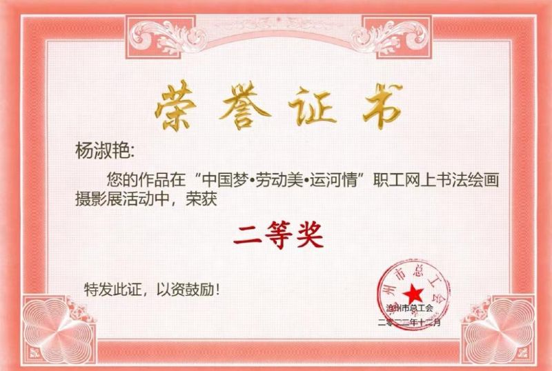 近日,從滄州總工會(huì)傳來(lái)好消息,公司職工楊淑艷攝影作品《搶修》在滄州總工會(huì)舉辦的“中國(guó)夢(mèng)·勞動(dòng)美·運(yùn)河情”職工網(wǎng)上書法繪畫攝影展活動(dòng)中獲得二等獎(jiǎng)。