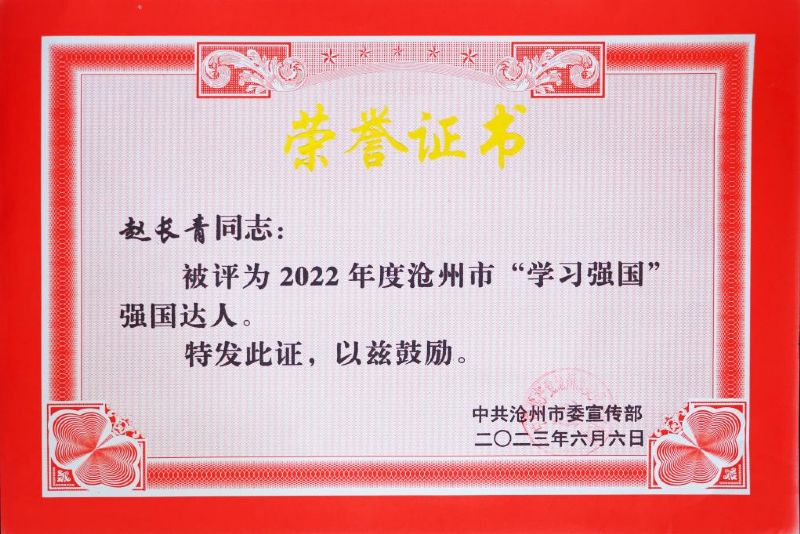 日前,在滄州市委宣傳部學習強國“強國達人”評選活動中,滄鹽集團電力有限公司職工趙長青以優(yōu)異成績被評為2022年度“學習強國”強國達人榮譽稱號。