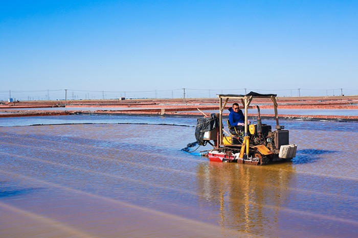 青鋒公司鹽區(qū)四副灘同時(shí)開耙,扒鹽、活茬全部采用機(jī)械作業(yè)。目前,鹵水充足,每天可完成2個(gè)結(jié)晶池收鹽。