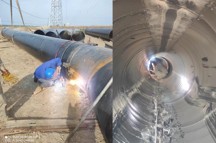 鹵水泵站輸水管道是鹵水供應(yīng)系統(tǒng)的重要組成部分,其質(zhì)量和穩(wěn)定性直接關(guān)系到鹵水的供應(yīng)效率和安全性,焊接工作尤為重要!皫煾怠眰冊诠さ噩F(xiàn)場切割、打磨、焊接,由于工作的特殊性,他們必須身穿長袖工作服,頭戴電焊帽,在烈日與弧光的雙重“烤驗”下,臉頰和后背已滿是汗水。然而,為確保管線每一道焊縫的焊接質(zhì)量、每一米管道的穩(wěn)定可靠,職工們抓工期,戰(zhàn)高溫、斗酷暑,確保鹵水泵站輸水管道工程安全、優(yōu)質(zhì)、高效進行。