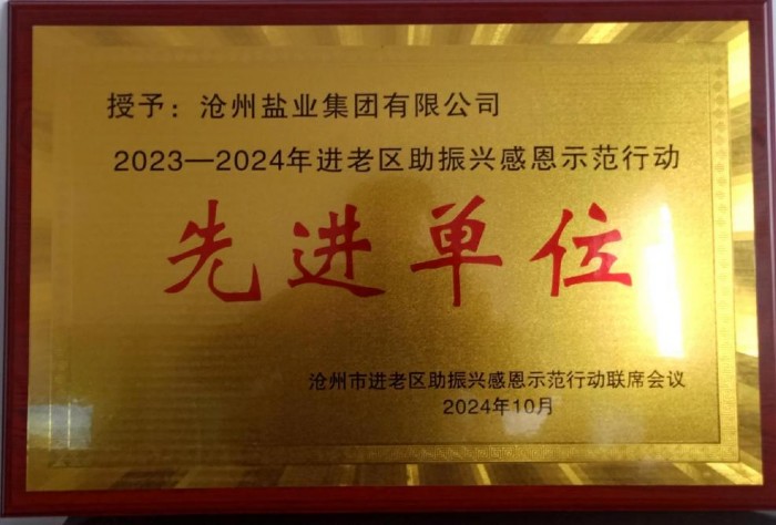 10月29、30日,滄州市進老區(qū)助振興感恩示范行動聯(lián)席會議召開全市感恩示范行動觀摩活動暨總結(jié)會議。滄州鹽業(yè)集團有限公司被授予“先進市、縣幫扶理事單位”。