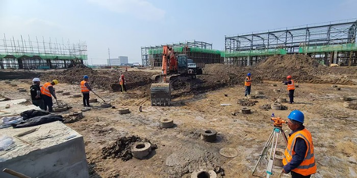 建筑工程公司為確保項目施工進度,節(jié)前召開專題會議,對“五一”期間的施工任務進行詳細安排,制定了科學合理的施工計劃。鳴歧項目為了提高施工進度,利用晚上時間進土,晝夜奮戰(zhàn),保障了各個施工單體及場地基礎回填用土需要,假期期間進土1萬余方,為后續(xù)施工進度奠定了堅實基礎。為確保長蘆鹽業(yè)公司泵站工程順利推進,工程技術部調(diào)配技術骨干班組,開啟了全天候奮戰(zhàn)模式。截至目前,鳴歧項目一、二車間基礎墻砌筑、圈梁澆筑已完成;港城填方項目已完成噴砂區(qū)填方并通過驗收,其他項目正在加快推進中。