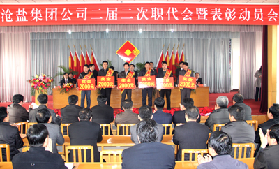在下午的表彰動員大會上,黨委書記、董事長程同海作了總結動員講話,要求全公司干部職工要按照總公司第二次黨代會和2012年工作會議的要求,全面做好今后的各項工作;要認真貫徹落實好職工代表大會精神,增強責任感和使命感,以身作則、率先垂范、攻堅克難,在推進企業(yè)科學發(fā)展的進程中再作新貢獻。在分析了當前的生產(chǎn)經(jīng)營形勢和國內(nèi)國際經(jīng)濟形勢后,程同海指出,2012年的工作重點為“鞏固基礎、強化管理、推進改革、爭取政策、創(chuàng)先爭優(yōu)”。他強調(diào),要繼續(xù)鞏固原鹽產(chǎn)業(yè)的支柱地位,帶動和引領其他產(chǎn)業(yè)協(xié)調(diào)發(fā)展;要強化細化管理,做好各項基礎管理工作,加強安全管理,民主管理和隊級民主管理,努力向管理要效益;要積極推進三定改革,創(chuàng)新機制,提高企業(yè)的活力與市場競爭力;積極爭取政府的有關政策、妥善處理職工中的焦點熱點問題,確保企業(yè)穩(wěn)定;繼續(xù)大力抓好創(chuàng)先爭優(yōu)活動第四階段的各項工作,以優(yōu)異成績向黨的十八大獻禮。