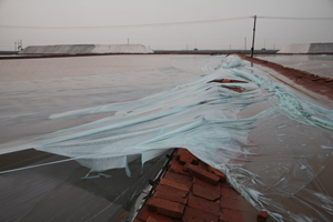 此次災(zāi)害性天氣,造成公司生產(chǎn)場區(qū)大面積結(jié)晶塑膜被毀,部分苫封鹽膜被掀。盡管各生產(chǎn)單元組織人員頂風(fēng)冒雨對(duì)刮開撕裂的結(jié)晶池塑膜進(jìn)行了緊急搶修,但由于塑膜受損面積大,仍造成部分結(jié)晶池鹵水嚴(yán)重稀釋,池存鹽受到一定程度的損失,給即將到來的汛前制鹵工作帶來困難,對(duì)塑苫池雨季曬鹽造成嚴(yán)重威脅。據(jù)統(tǒng)計(jì),因颶風(fēng)撕裂損壞塑膜5763公畝,徹底報(bào)廢塑膜1140公畝,損壞滑道10160米,浮板1901米,宿舍、機(jī)房頂瓦被掀5500塊,長度約1200米的鹽碼苫封塑膜被徹底損毀。